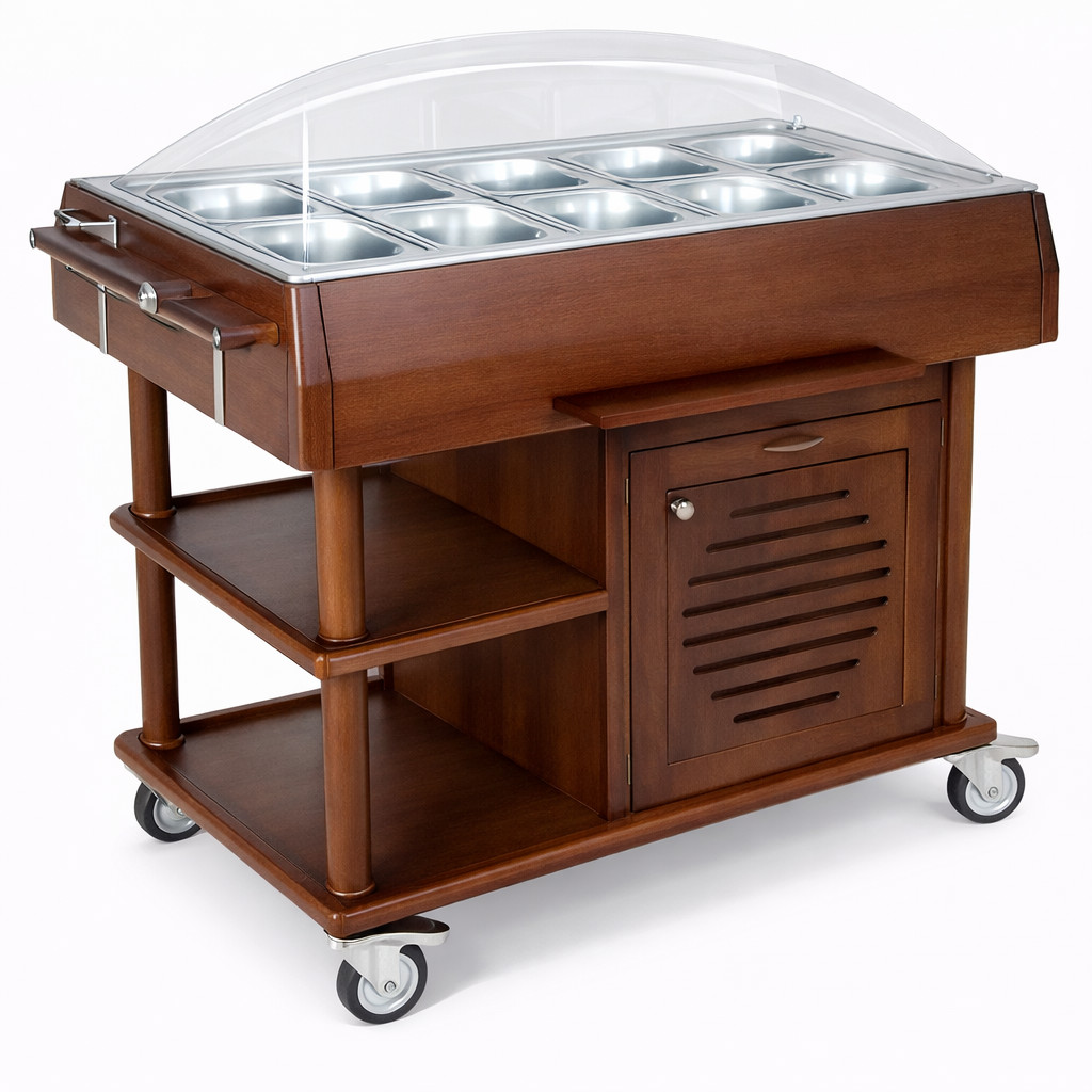 » Termosztáttal szabályozott hűtőrendszer kompresszorral » Rozsdamentes acél hűtőfelület» 10 x ¼ GN űrtartalom» Rozsdamentes acél jégtároló» Plexiüveg fedél» Kihúzható tálalóasztal» Tolásra szolgáló fogantyú» 4 forgó kerék, 2 fékkelSz: 60 H: 105 M: 105 cm