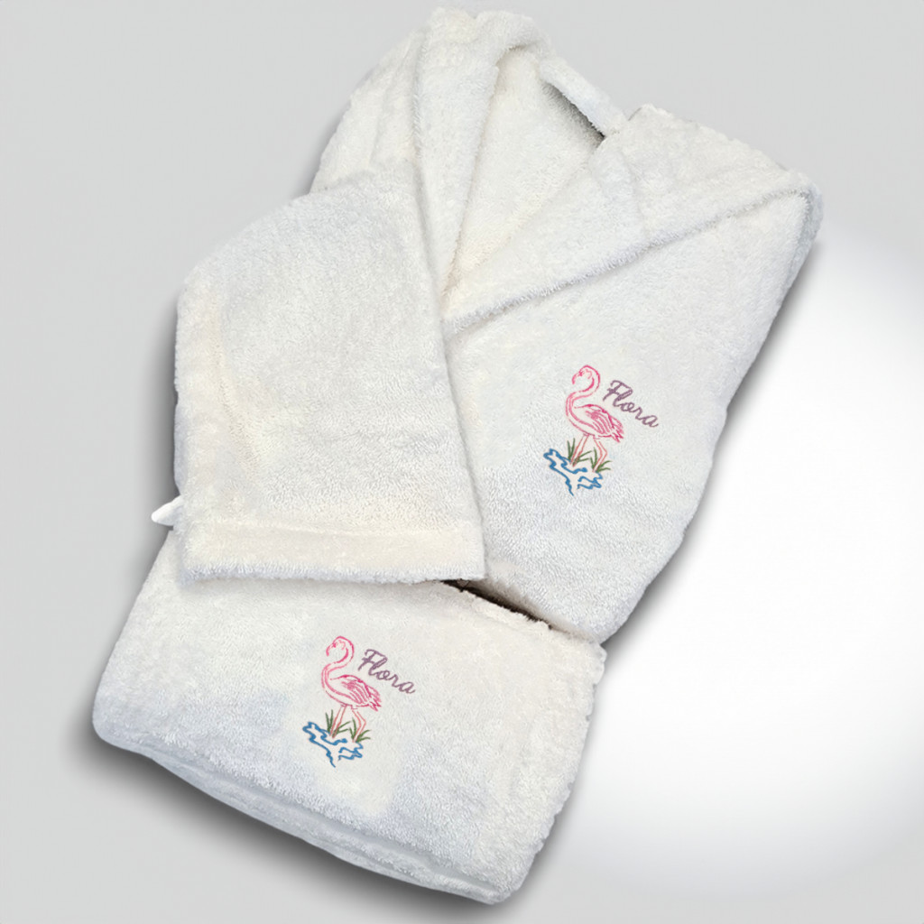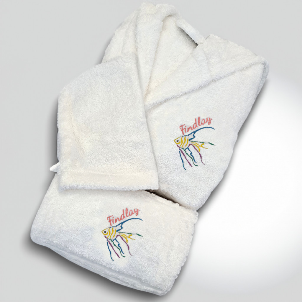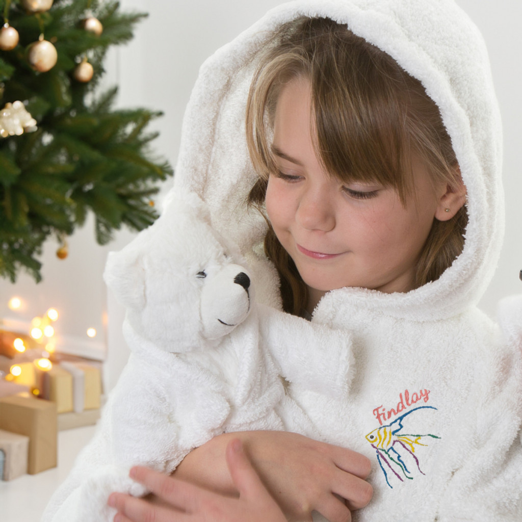 • Kényelmes fehér 100% pamut fürdőköpeny (2-3 éves kortól 10-11 éves korig): Puha és nedvszívó, kapucnival az extra melegért, és választható motívummal és névvel hímezve a bal mellkason.