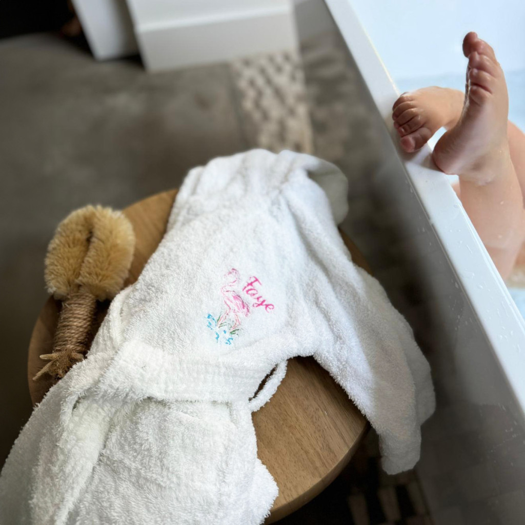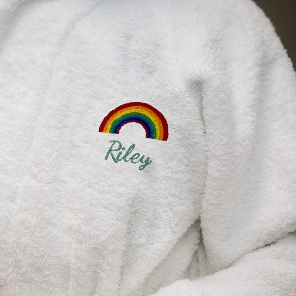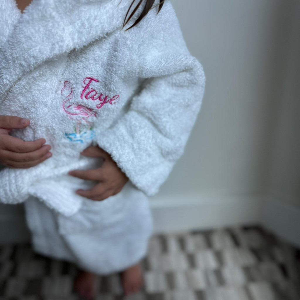 • Kényelmes fehér 100% pamut fürdőköpeny (2-3 éves kortól 10-11 éves korig): Puha és nedvszívó, kapucnival az extra melegért, és választható motívummal és névvel hímezve a bal mellkason.