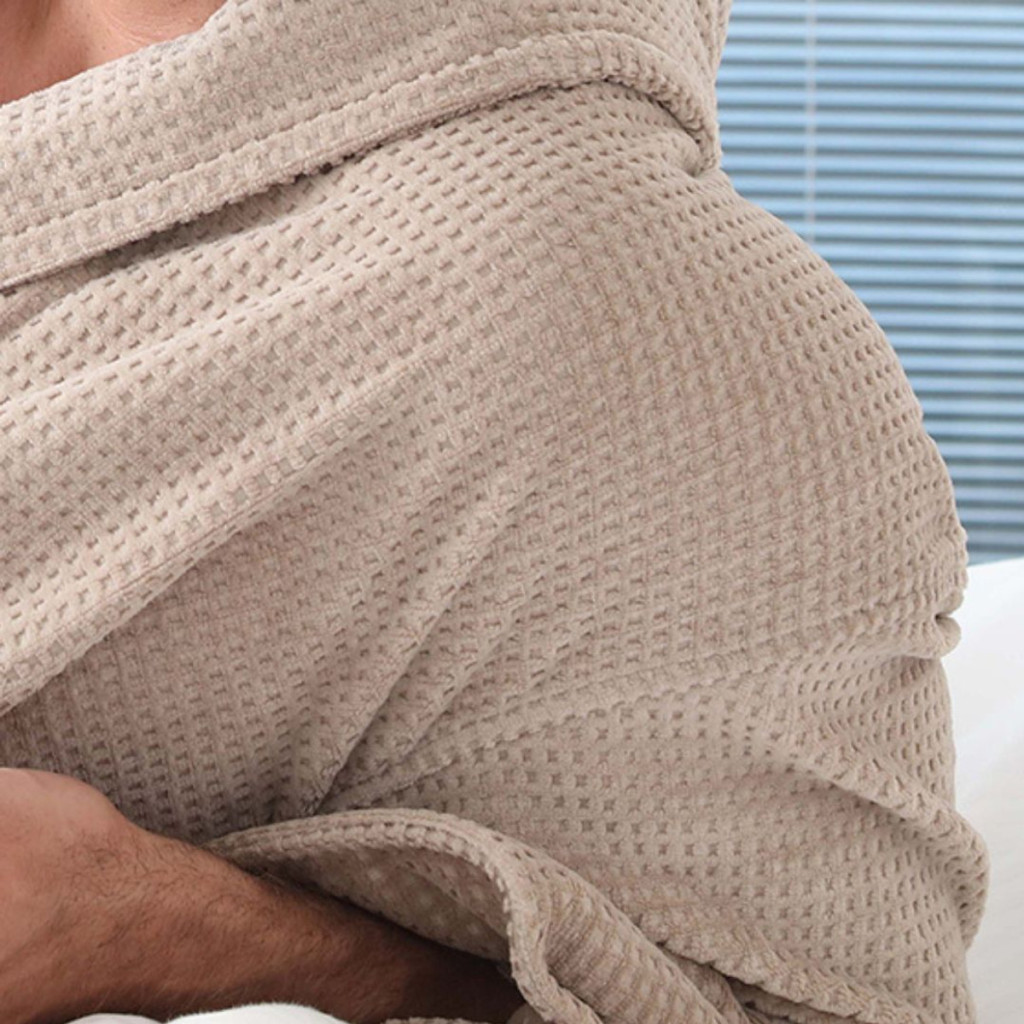 Bársonyosan puha velúrból készült, jellegzetes, apró gofrimintával, ez a fürdőköpeny a textúrát páratlan puhasággal ötvözi. A dizájn plüss fürdőlepedő belső része kiváló nedvszívó képességet biztosít, így kényelmesen szárazon maradhatsz. Sálgallérral, felhajtott mandzsettával és mély zsebekkel, valamint dupla övbújtatókkal a testreszabható derékszíjért, az eleganciát és a funkcionalitást testesíti meg. Fehér, elefántcsont és kavicsos, derűs árnyalatokban, valamint M, XL és XXL méretekben kapható, ez a köntös számos preferenciát kielégít, miközben bőséges szabást ígér. Hímzés is kérhető, így személyes vagy professzionális megjelenést kölcsönözhetsz neki.