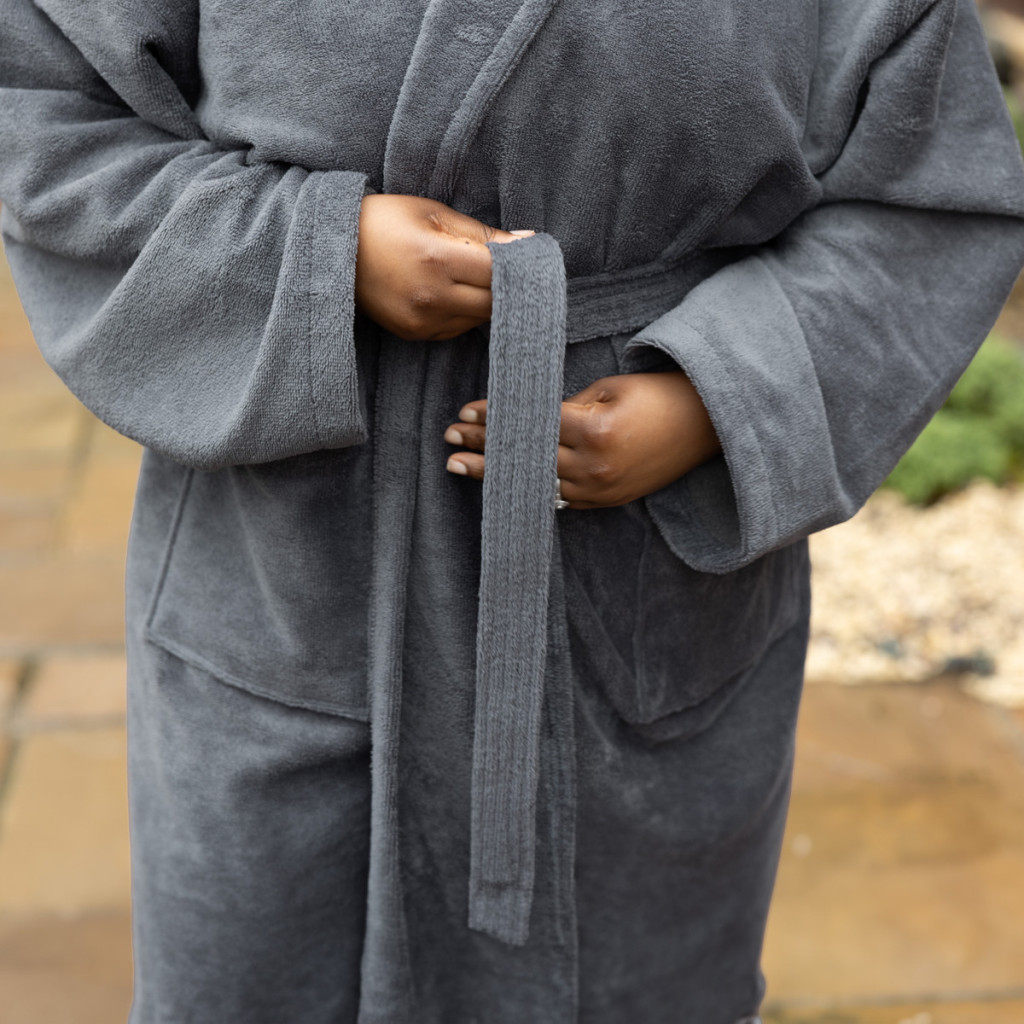 A SupremeSoft® fürdőköpeny a SmartSoft® termékcsaládunk része, amely kiemelkedő választás mind a professzionális spa/szállodai környezetbe, mind a személyes luxushoz. Egyedi, puha poliészter külső és nedvszívó frottírbelső összetételének köszönhetően ez a 300 g/m²-es köntös a puhaság és a funkcionalitás kivételes keverékét kínálja.