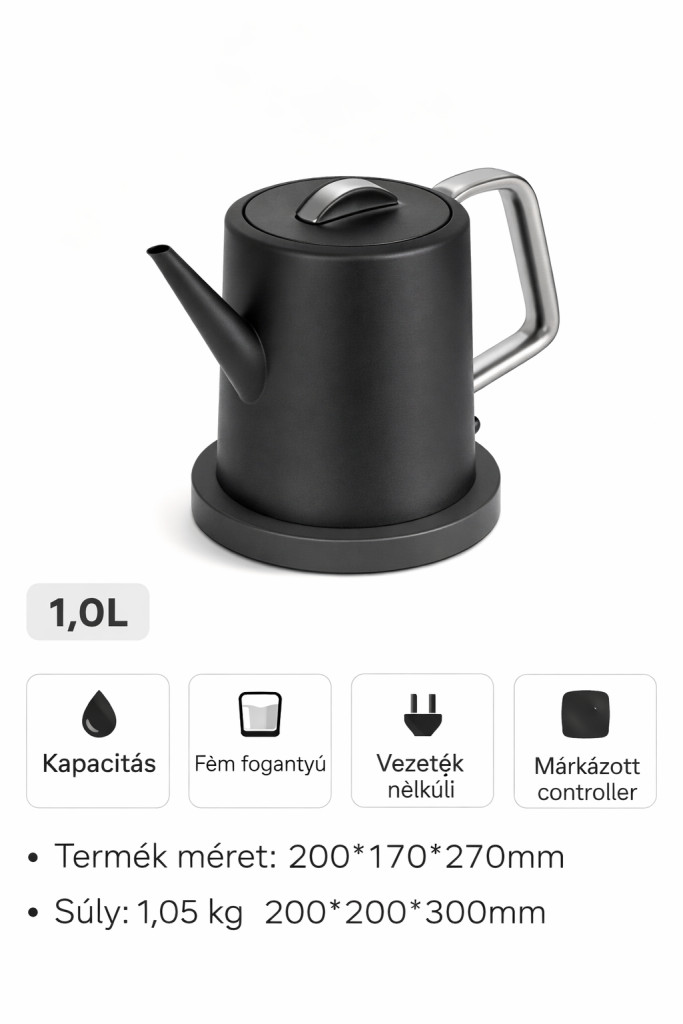 Compact, modern electric vízforraló, ideal for hotel rooms, apartments, or office use. Fast heating, stable performance, és sleek design all in one device.